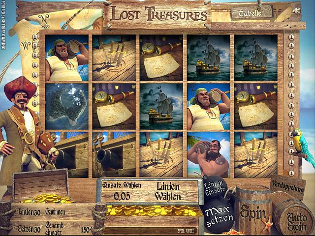 Sheriff Gaming hat Lost Treasures im Frühling 2013 ins Portfolio vom Sunmaker Casino befördert und eröffnet damit neue Dimensionen in Sachen Spielerlebnis. Online Casinos wie dieses haben den Vorteil, dass du erst einmal ganz unverbindlich reinschnuppern darfst und nicht gleich volles Risiko fahren musst. Nutze also die Zeit, die dir hier zum kostenfreien Testen geboten wird – so lange und so oft du möchtest. Bei Lost Treasures geht es mächtig zur Sache, denn hier haben die Piraten die Oberhand und werden dir mächtig Dampf machen. Entweder bewunderst du sie und lässt dich von ihnen mit Gewinnen überschütten, oder aber du stellst dich gleich auf ihre Seite und wartest einfach ab, welche Auszahlungen für dich drin sind. Das dreidimensionale Design ist einzigartig und wirkt fast wie in einem Kinofilm. Realistisch sind die Ausschüttungen natürlich, und genau sie werden dir so manches Mal ein Schmunzeln ins Gesicht zaubern.